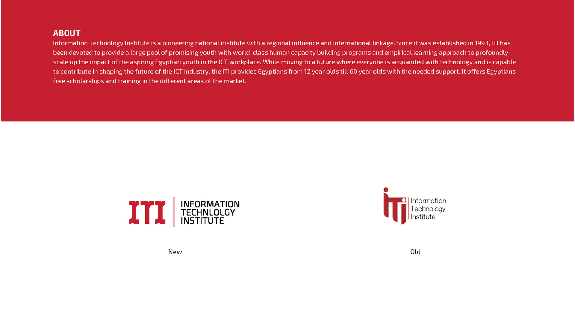 Information Technology Institute is a pioneering national institute with a regional influence and international linkage. Since it was established in 1993, ITI has been devoted to provide a large pool of promising youth with world-class human capacity building programs and empirical learning approach to profoundly scale up the impact of the aspiring Egyptian youth in the ICT workplace. While moving to a future where everyone is acquainted with technology and is capable to contribute in shaping the future of the ICT industry, the ITI provides Egyptians from 12 year olds till 60 year olds with the needed support. It offers Egyptians free scholarships and training in the different areas of the market.